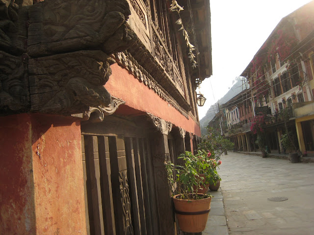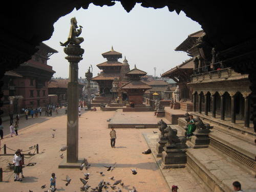 ville beaucoup moins polluée et moins bruyante que Katmandou. Cette petite ville à l’aspect médiéval a pu garder son charme. Nous nous dirigeons vers la place du Durbar, de forme allongée : sur le côté est, se trouve le palais royal, sur le côté ouest une succession de temples et derrière, une petite rue bordée de boutiques d'artisanat.
