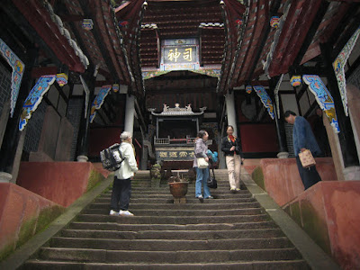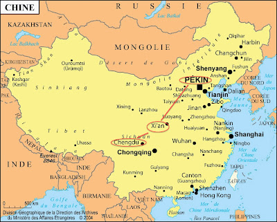 Voilà que je n’ai rien noté sur cette ville et déjà je ne me souviens plus du tout !!! par contre je me souviens que nous avions laissé nos valises à l’hôtel et pris seulement notre sac à dos pour aller faire un périple à QINGCHENG SHAN (mont de la Cité d’Azur) montagne sacrée taoïste à 80 km de CHENGDU.